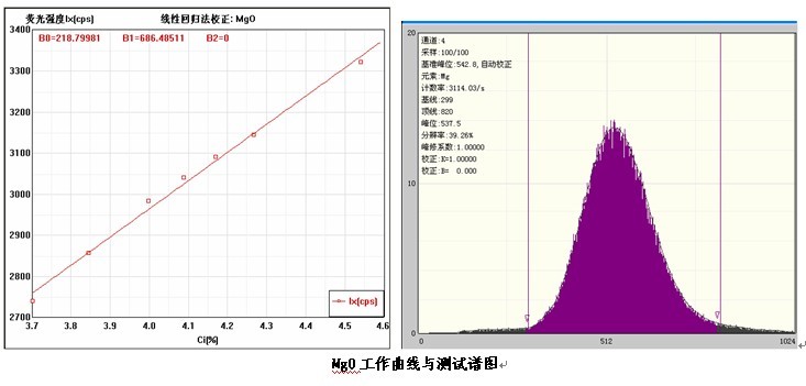 各個(gè)元素的工作曲線與測(cè)試譜圖,其中B0為曲線節(jié)距;B1:為曲線斜率;在測(cè)試譜圖中有元素的測(cè)試信息:計(jì)數(shù)率,采樣時(shí)間,分辨率等。