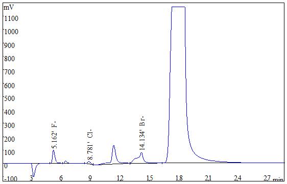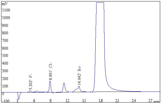 2.實(shí)驗(yàn)前處理準(zhǔn)確稱取0.2g(精確至0.0001g)試樣,采用氧彈燃燒后冷卻定容,經(jīng)0.22μm的水系濾膜過濾后上機(jī)得到測試譜圖如下圖2、圖3所示。