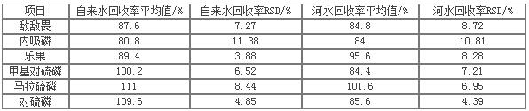 在自來水和河水中加入0.5ug 6種有機(jī)磷混標(biāo),分別作三次平行樣,按處理樣品的方法進(jìn)行樣品前處理,GC-MS 6800測試,采用外標(biāo)法定量,計(jì)算其回收率,數(shù)據(jù)見下表: