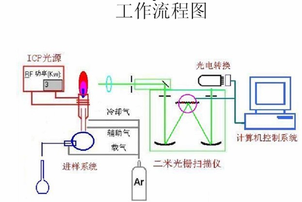溶液進(jìn)入等離子體光源中受激發(fā),釋放出光子,形成該元素的特性譜線,譜線的強(qiáng)度和蒸汽中原子的濃度成正比,進(jìn)行定量測定。