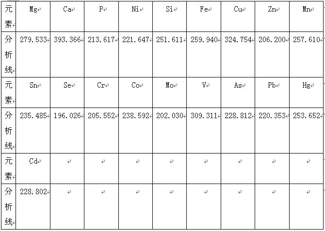 根據(jù)ICP軟件譜線庫(kù)提供所有元素不同譜線,首先選擇被測(cè)元素靈敏度高 的譜線,其次考慮不受樣品基體及被測(cè)元素相互之間干擾小的譜線的原則,選擇分析線如下。