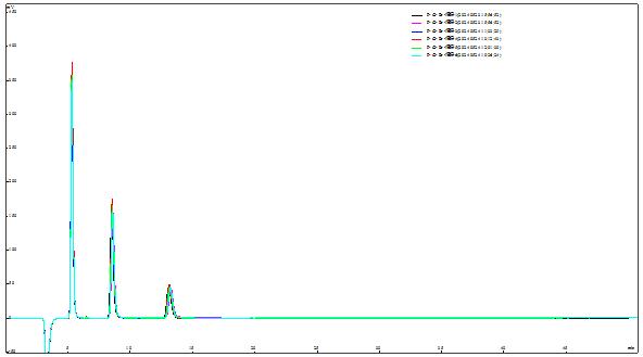3.儀器定性及定量重復(fù)性考察取2.0μg/mL F-、Cl-、Br-混合標(biāo)準(zhǔn)標(biāo)準(zhǔn)溶液重復(fù)進(jìn)樣6次,考察保留時(shí)間和峰面積的重復(fù)性,詳見圖4;其中保留時(shí)間(tR)相對偏差在0.10%-0.16%之間,峰面積(S)的相對標(biāo)準(zhǔn)偏差在0.38%~0.53%之間,重復(fù)性結(jié)果詳見表1。