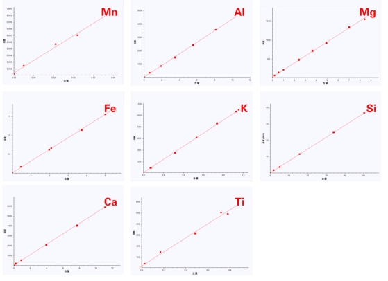 設定適當?shù)臏y量條件,使用X射線熒光光譜儀掃描一系列含量已知的石墨標準物質(zhì)或石墨二次標樣,該系列樣品中需關注元素Mg、Al、Si、K、Ca、Ti、Mn、Fe等元素含量與強度的一次線性校正工作曲線。然后,對未知石墨樣品進行測量。