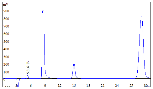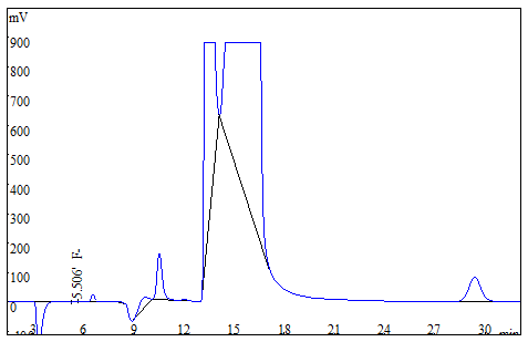 將大米、茶葉試樣分別粉粹后過篩,各稱取0.25g(精確至0.0001g),于氧彈燃燒儀進行燃燒,冷卻后定容,經(jīng)0.22μm的水系濾膜過濾后上機得到樣品譜圖,如下圖3、圖4所示;食用油樣品直接稱重后進行氧彈燃燒,測試得到的譜圖如圖5所示;生活飲用水直接上機后得到樣品譜圖詳見圖6。其中大米、茶葉、食用油中氟離子的測定結(jié)果均低于方法檢出限,同時對4種試樣進行了加標(biāo)處理,加標(biāo)回收率在95.6%~102.3%之間。測試數(shù)據(jù)詳見表2。